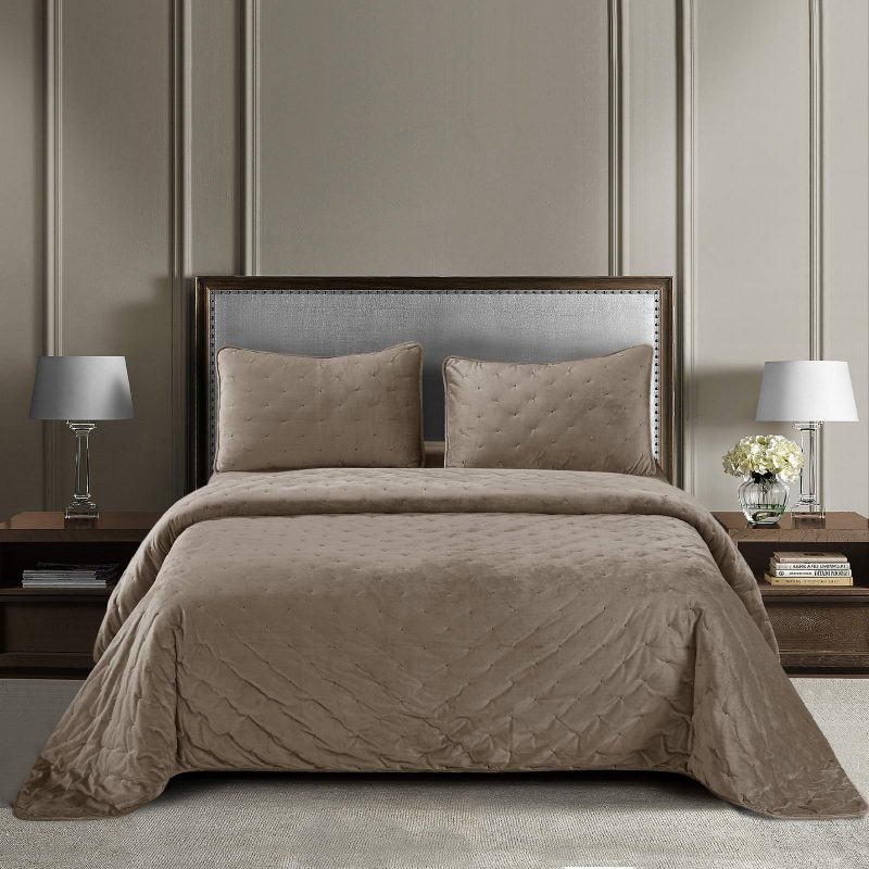 Покрывало Селена выполнено в девяти оттенках: пудра, антрацит, беж, изумруд, капучино, пепел роза, серебро, стоун, терракот. Они подойдут практически для любого интерьера, от классического, до модерна или романтического. Стеганое бархатное покрывало будет необыкновенно смотреться на вашей постели, в дополнение в комплект входят две наволочки того же цвета.