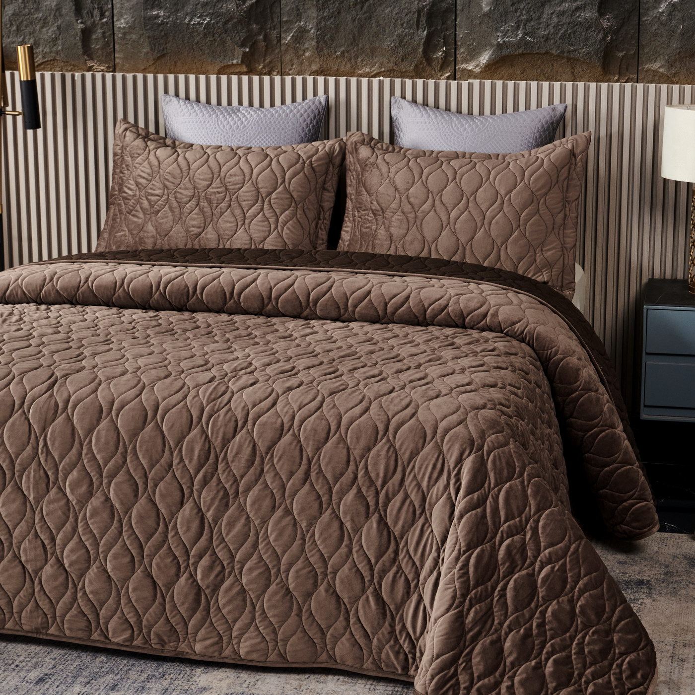 Покрывало Селена выполнено в девяти оттенках: пудра, антрацит, беж, изумруд, капучино, пепел роза, серебро, стоун, терракот. Они подойдут практически для любого интерьера, от классического, до модерна или романтического. Стеганое бархатное покрывало будет необыкновенно смотреться на вашей постели, в дополнение в комплект входят две наволочки того же цвета.