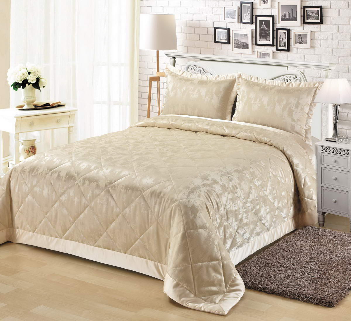 Стеганое, жаккардовое покрывало на подкладке из плотной декоративной ткани. Отличительной особенностью данной модели является её оригинальный жаккардовый рисунок. Данное стеганое покрывало представляет собой многослойное изделие, внешняя часть изделия состоит из жаккардового полотна, а внутренний наполнитель состоит из силиконизированного волокна плотность которго составляет 100г/м2. Для того, чтобы внутренний слой не сбивался в комки и создать фактурность внешних слоев, по всей площади покрывала производится простежка (прошивание). Это могут быть ровные линии или фантазийные узоры.