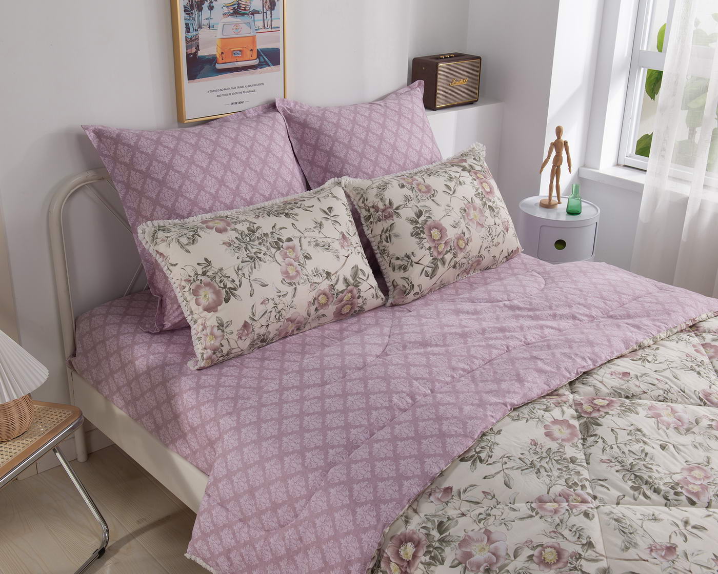 В комплект входят простыня, наволочки и одеяло. Одеяло простеганное, легкое и воздушное, его можно стирать в стиральной машине. Благодаря микроволокну в составе наполнителя для одеяла, оно всегда принимает свою начальную форму.
